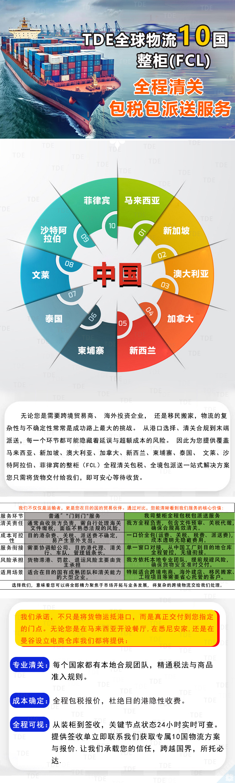 TDE全球物流10国整柜(FCL)全程清关包税包派送服务
